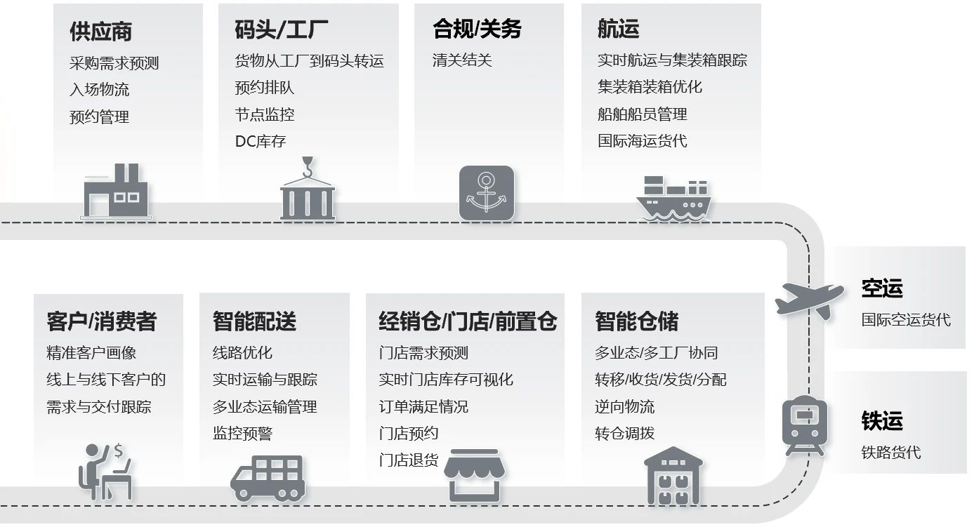 從原材料到生產(chǎn)線,從倉儲到海、陸、空、鐵運(yùn)輸配送,從經(jīng)銷商、門店等營銷渠道到產(chǎn)品交付給最終客戶及消費(fèi)者;打通上下游數(shù)據(jù),提供從訂單履行、倉配協(xié)同、智能優(yōu)化及到數(shù)據(jù)洞察的一體化解決方案,實(shí)現(xiàn)端到端協(xié)同與可視。讓供應(yīng)鏈各個環(huán)節(jié)的信息透明化,以確保供應(yīng)鏈的及時響應(yīng)與高效運(yùn)轉(zhuǎn)。