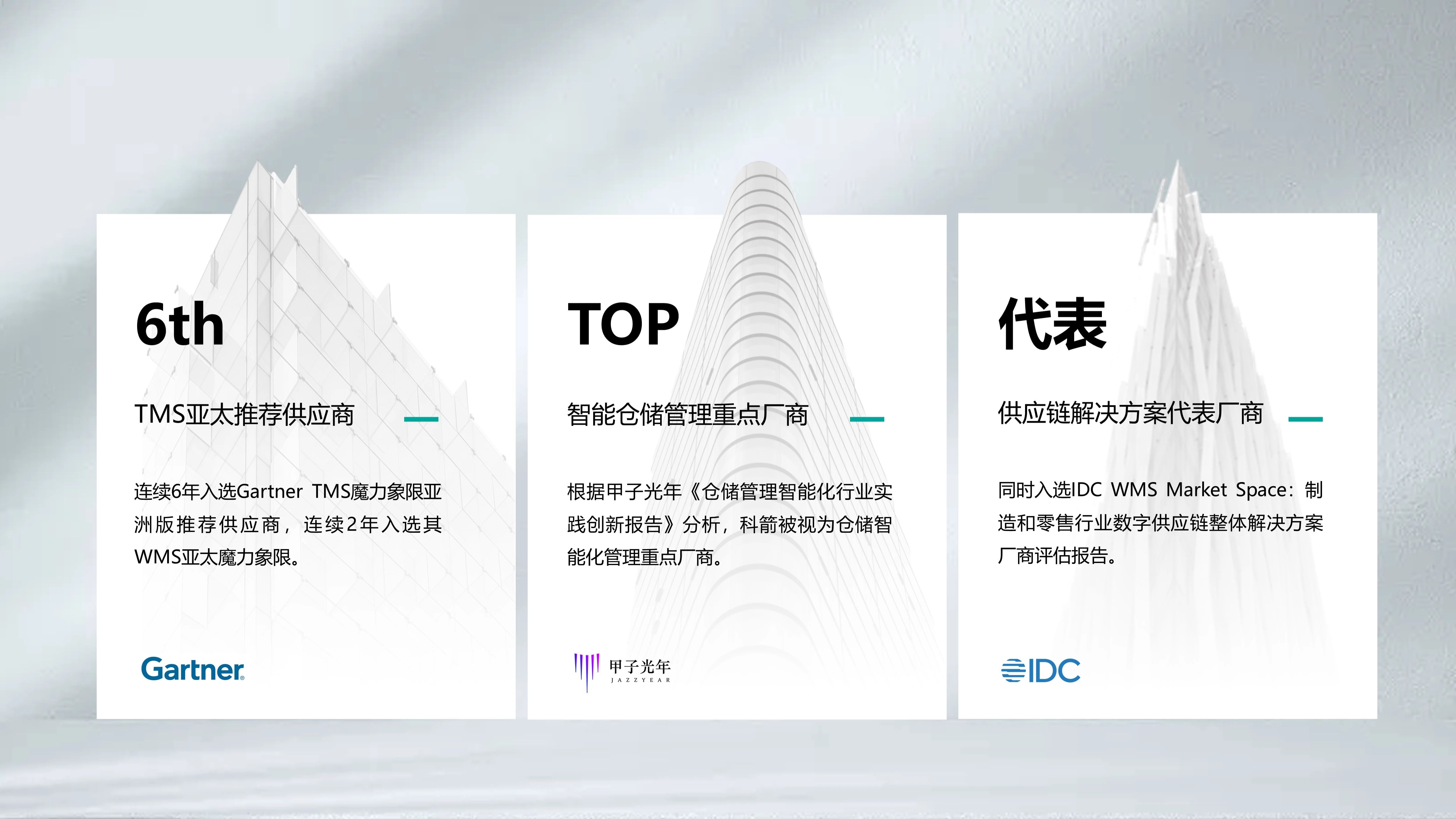 很榮幸,我們的產(chǎn)品服務(wù)作為典型被多份重磅行業(yè)報(bào)告收錄和推薦,其中已連續(xù)6年入選Gartner TMS/WMS魔力象限亞太版。除此之外,更憑借創(chuàng)新物流技術(shù)走向應(yīng)用落地和商業(yè)化的成功案例獲得了媒體的諸多認(rèn)可。