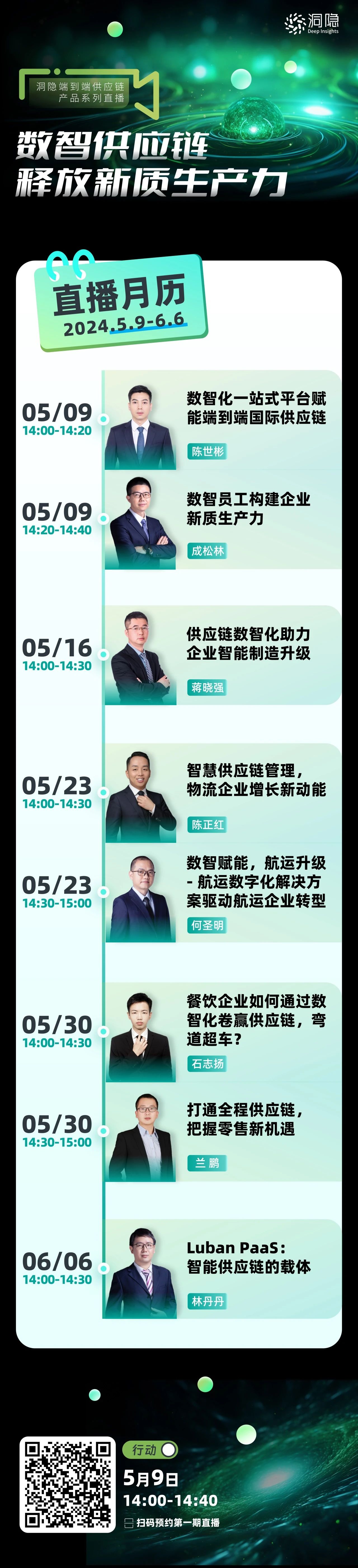 在此變局下,洞隱基于面向供應(yīng)鏈未來(lái)的產(chǎn)品設(shè)計(jì)和20年供應(yīng)鏈數(shù)字化實(shí)戰(zhàn)累積,特別策劃了“數(shù)智供應(yīng)鏈,釋放新質(zhì)生產(chǎn)力”系列直播,期待可以為貨主、物流企業(yè)實(shí)現(xiàn)生產(chǎn)力升級(jí)提供路徑參考和落地支持。