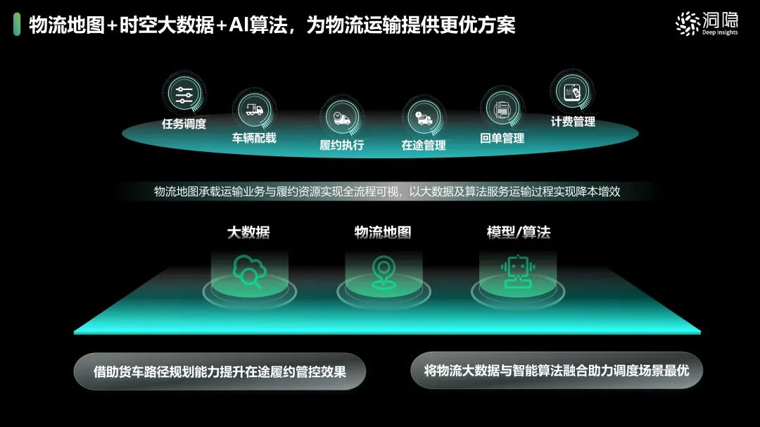 其中在“運(yùn)輸+AI”的場(chǎng)景中,洞隱與高德云圖聯(lián)合推出了“智慧貨運(yùn)地圖”解決方案,將物流地圖結(jié)合時(shí)空大數(shù)據(jù)、AI大模型與算法一起為物流運(yùn)輸提供更優(yōu)方案。
