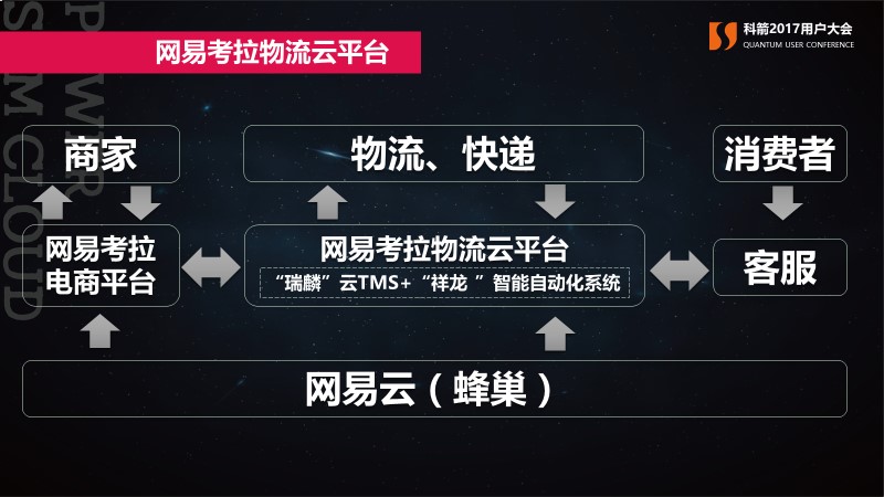 基于以上思考我們與科箭一起聯(lián)合打造了“瑞麟”TMS云平臺(tái),再加上“祥龍 ”智能自動(dòng)化系統(tǒng),構(gòu)成了網(wǎng)易考拉的物流云平臺(tái)。基于網(wǎng)易云把網(wǎng)易考拉平臺(tái)上的商家、用戶、消費(fèi)者、客服、快遞無(wú)縫連接,整個(gè)訂單履約環(huán)節(jié)做得更清晰更明確。