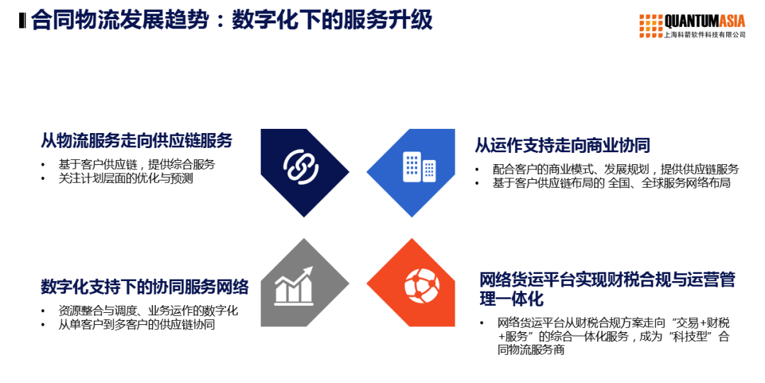 1、從物流服務走向供應鏈服務:基于客戶供應鏈,提供綜合服務,關注計劃層面的優(yōu)化與預測。