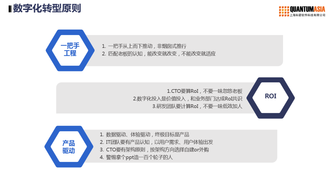 李濟宏強調(diào),數(shù)據(jù)化轉型的原則非常重要,它一定要是從上而下推動的“一把手工程”,必須有強大的推動力。數(shù)字化投入是內(nèi)部的,是價值投入,要和業(yè)務部門達成ROI共識。數(shù)字化轉型要依靠產(chǎn)品驅動。
