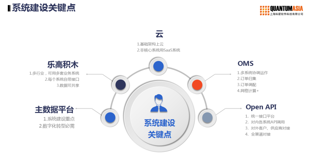 主數(shù)據(jù)平臺、樂高積木模型、云、OMS、Open API是系統(tǒng)建設的五大關鍵點,它們是為數(shù)據(jù)化轉型服務的,如果沒能抓住這五個方面,只能信息化不能數(shù)據(jù)化。