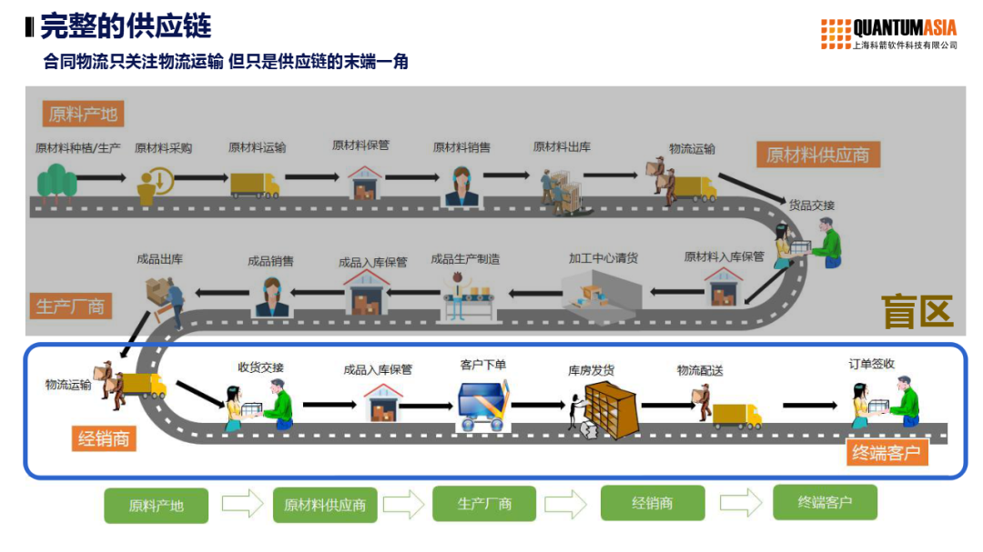 從甲方視角看,下圖的全部環(huán)節(jié)加起來組成一個完整的供應鏈,從原材料采購、研發(fā)、生產(chǎn),到經(jīng)銷商B to B、B to C,但很多第三方物流只關注物流運輸,只關心成品銷售、出庫和物流運輸、收貨交接的部分,但這只是供應鏈末端的一角,導致供應鏈的其它部分,成為盲區(qū)。