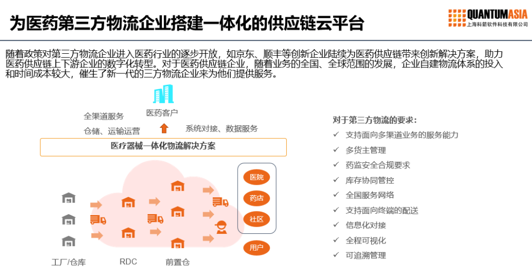 科箭還為醫藥第三方物流企業搭建一體化的供應鏈云平臺。蘭鵬指出,隨著政策對第三方物流企業進入醫藥行業的逐步放開,如京東、順豐等創新企業陸續為醫藥供應鏈帶來創新解決方案,助力醫藥供應鏈上下游企業的數字化轉型。對于醫藥供應鏈企業,隨著業務在全國、全球范圍的發展,企業自建物流體系投入和時間成本較大,催生了新一代的三方物流企業來為他們提供服務。