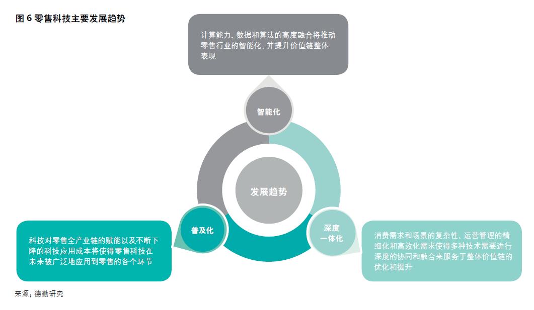 報告基于目前科技在市場上的應用與發展情況,歸納出科技對零售業的重塑所呈現出的六大主要變革趨勢,即全面數據化、智能普惠化、深度一體化、應用普及化、促進降本增效、加速融合創新。