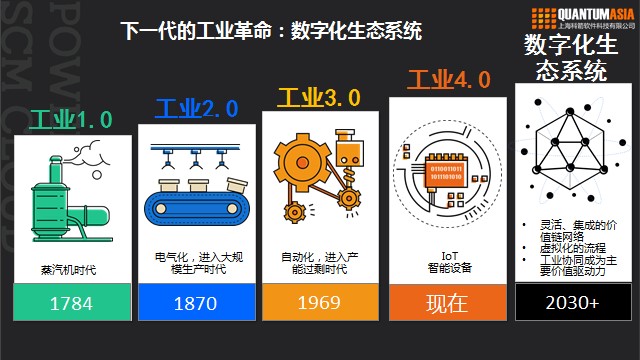 現今工業的模式已經和最初完全不同了,經過一系列的變遷,由最早的工業1.0進化到了如今基于工業互聯網、人工智能的工業4.0時代,而其中供應鏈環節也成為了高度信息化過程中必不可少的一部分,甚至可以說是核心。下一代的工業革命,將是數字化驅動的、通過構建生態系統打造靈活、集成的價值鏈網絡。在數字化生態系統下,工業協同成為主要價值驅動力。