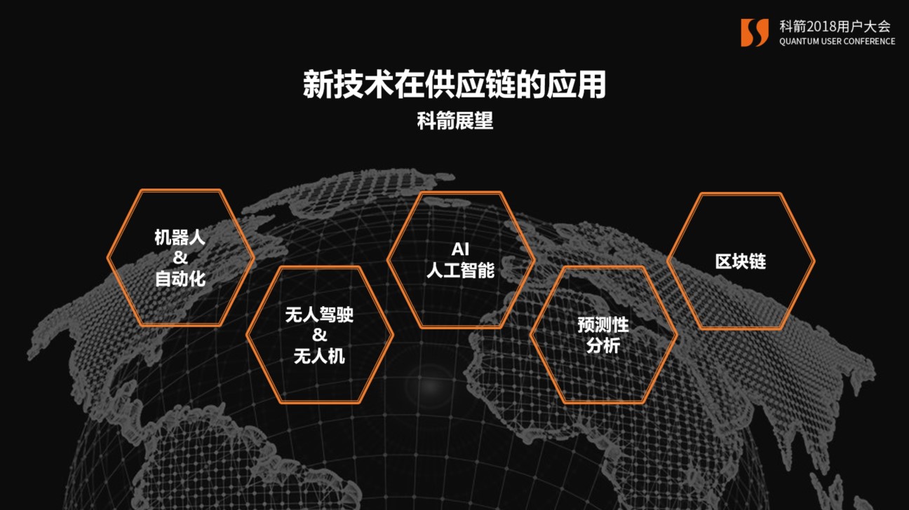 我們也一直在研究和嘗試一些新的技術,比如說機器人和自動化,打造一個更加智能化、安全、高效的執(zhí)行體系。無人駕駛和無人機,它會使我們整個物流更加準確。人工智能AI,這個目前我們一直在做,我們會發(fā)現在整個供應鏈執(zhí)行過程當中會涉及到很多的算法,比如說TMS云和阿里云在合作,怎么樣把城市配送的路徑優(yōu)化做得更加好。同樣我們會做一些算法,怎樣有更好的解決方案讓裝箱要更加合理、準確。另外很多的第三方物流,怎么讓結費的引擎更加強大,除了提供幾十種結算模式,是不是未來可以給客戶提供更加可配置的引擎。這些都是我們在人工智能和AI算法上做了很多的嘗試,包括倉庫執(zhí)行端,整個上架算法都是需要不斷優(yōu)化的。最后說一下區(qū)塊鏈技術,某些行業(yè)客戶也已經提出了具體需求,是不是能夠把供應鏈上的數據以塊狀的方式在鏈條上永久存儲,比如期貨的銅和鋁,從供應商到制造商,從制造商到經銷商到物流公司到最終客戶,然后再到金融機構,科箭也會在這一領域做一些嘗試。