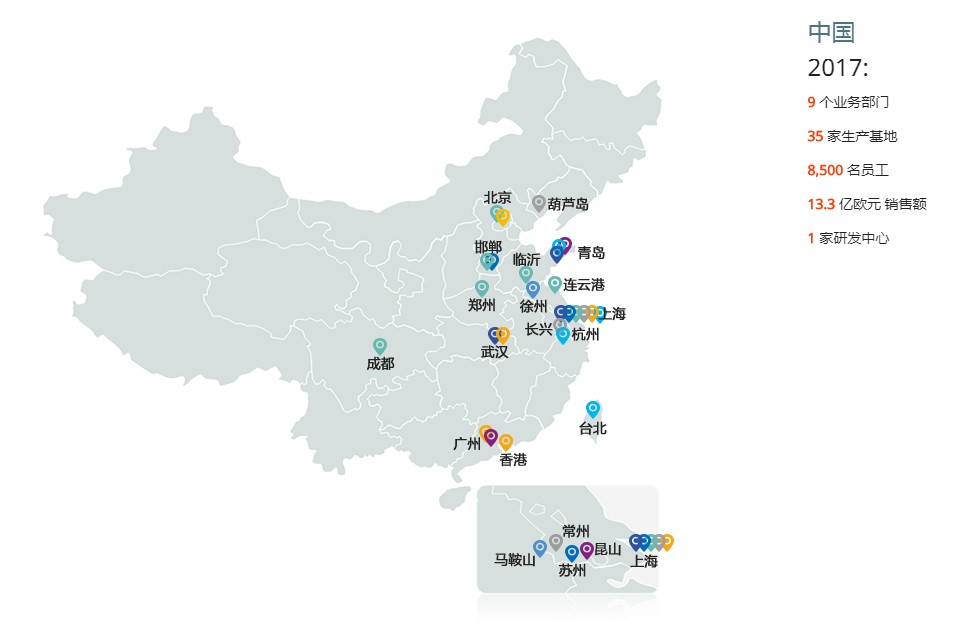 世界500強企業-法國圣戈班集團,自1985年進入中國市場,至今在華已設立1家研發中心和50多家企業及公司。解決方案廣泛應用于各大市場,從汽車玻璃到建筑玻璃,再到磨料磨具、陶瓷材料、耐火材料、高功能塑料、石膏建材、工業砂漿和球墨鑄鐵管道,為消費者提供豐富的解決方案。如今,圣戈班在華已擁有近8,500名員工,2017年營業額為13.3億歐元。
