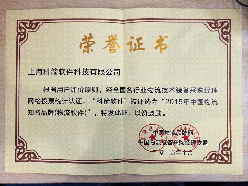 2015年10月28日 上海科箭軟件科技有限公司在上海新國際展覽中心舉行的“2015年中國物流技術與裝備知名品牌”頒獎典禮上,榮獲“2015年度物流軟件知名品牌”。此次頒獎典禮的舉辦獲得了亞太地區規模最大的展會CeMAT亞洲國際物流技術與運輸系統展覽會的鼎力支持。