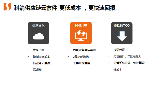 與傳統(tǒng)的供應(yīng)鏈系統(tǒng)相比,科箭的一體化供應(yīng)鏈云平臺(tái)具有快速實(shí)施、快速回報(bào)、場(chǎng)景化設(shè)計(jì)、可靈活配置、消費(fèi)級(jí)用戶體驗(yàn)等特點(diǎn)和優(yōu)勢(shì)。