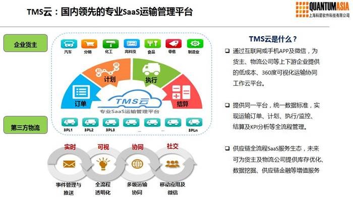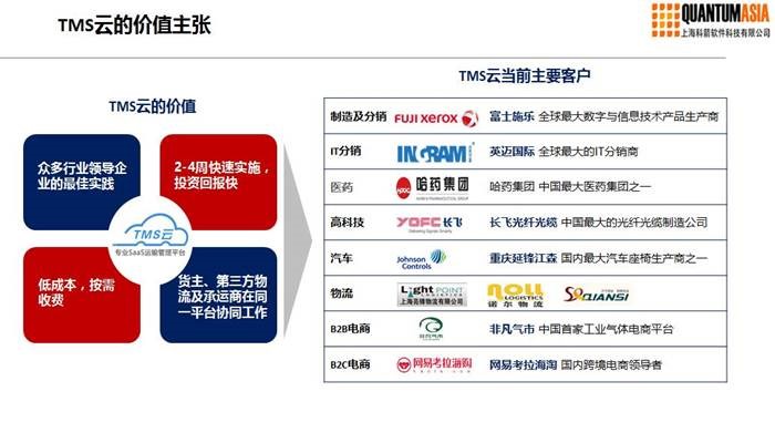 許:我們這款產(chǎn)品是今年年初時推向市場的,這款產(chǎn)品無論是對貨主企業(yè)還是專業(yè)的第三方物流公司,都能基于我們TMS云快速的搭建屬于他們自己的專業(yè)的物流管理系統(tǒng),這也是我們產(chǎn)品的一個亮點(diǎn):就是快速實施的專業(yè)TMS。同時我們這款TMS云產(chǎn)品也是一個開放的平臺,它不僅僅是服務(wù)于一家企業(yè),它還可以幫助我們的客戶企業(yè)為他們上、下游的合作伙伴提供一個實時的透明的監(jiān)控平臺。