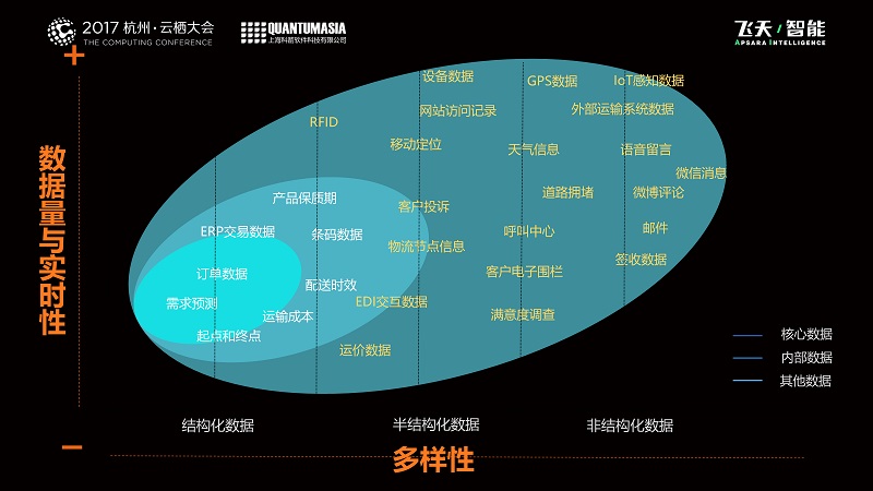 IDC與EMC有個報告,到2020年,數據宇宙的量級在40000EB,相當于人均數據量是5000GB。具體到供應鏈中,我們可以看到,在當前的數字時代,可用的供應鏈的數據的確變得更加龐雜,企業能夠獲得的數據不限于以ERP為核心的結構化數據,還增加了許多半結構化數據和非結構化數據,這些數據來源于EDI的連接、供應商或三方物流的反饋、公共的交通服務信息等,比如天氣、車輛位置信息、實時的路況,還有大量的微信和QQ等社交往來記錄,也有了很多IoT的感知數據。這些都對新物流下的供應鏈管理帶來挑戰。