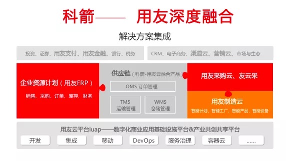 在短短的半年時間,科箭與用友不僅在產品融合上落地,更以融合一體化方式共同服務企業客戶。如今年共同為云南建投打造物流中臺,即在用友營銷中臺的基礎上,為企業提供科箭—用友云融合產品的物流中臺,包括TMS/WMS/OMS云,幫助企業實現一體化、中臺化的管理。