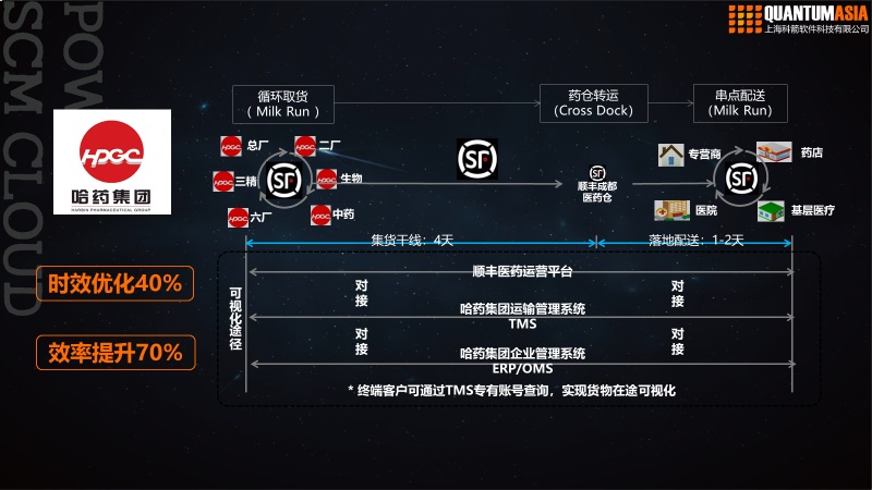 最后與大家分享科箭TMS云在哈藥集團的應用案例。只用了不到2個月,我們的TMS云在哈藥集團9家工廠上線,從原來各家工廠獨立運營到集團整體調控,并與順豐冷鏈平臺無縫連接,通過循環取貨,優化配送,實現了運輸配送的可視化。