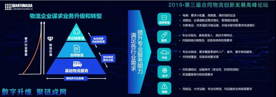 對合同物流企業來說,不同行業的客戶會有不同的需求,比如:消費零售、電商行業,追求小批量、快速、高頻度、高時效的運送。消費品行業對全渠道、所有業務配送的增長需求很快,管理復雜度很高。生鮮食品行業對溫控、冷鏈運輸的需求很高……這些都對合同物流企業提出了要求。比如:在醫藥行業,有專業化的物流,有自己的準入標準,如醫藥合規的一些監控,對物流企業的系統有很高的要求。汽車行業的入場、出場、備件、整車等,對物流的運輸倉儲、物流配送,到主機廠,供應商庫存的管理等,都提出了網絡覆蓋的要求,對信息化系統的要求也很高。還有,3C電子、電子類交付行業,要求實現快速響應。