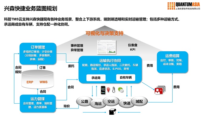 科箭TMS云標(biāo)準(zhǔn)產(chǎn)品和解決方案可完全支持興森對(duì)于運(yùn)輸訂單、計(jì)劃、執(zhí)行、監(jiān)控和結(jié)算的各種業(yè)務(wù)場(chǎng)景,整合上下游系統(tǒng),實(shí)現(xiàn)端到端透明和實(shí)時(shí)運(yùn)輸管理:包括多種運(yùn)輸方式、承運(yùn)商或自有車輛,支持倉(cāng)配一體化協(xié)同。