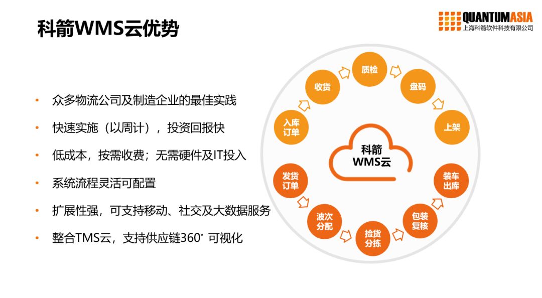 科箭在供應鏈領域擁有十多年的經驗,是國內最早轉型云端的供應鏈軟件公司。WMS云是基于行業沉淀設計的專業SaaS倉儲管理產品。針對制造、零售、物流及電商等行業,WMS云流程可配置,場景化設計,投資回報快。